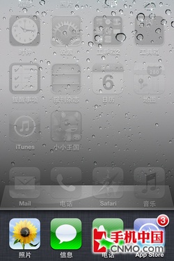 iOS 5系統在待機界面上與之前的系統沒有太多區別,依舊是4×4的圖標界面加上下方四顆常用應用界面,所有日常應用也是一應俱全。iOS將最常用的程序放在了第一頁,比如短信、電話、時鐘、日歷等。每個應用下方還都有文字注釋,方便用戶識別應用的功能。當用戶有未接來電、信息或者提醒時,應用右上角還會出現醒目的計數提示。