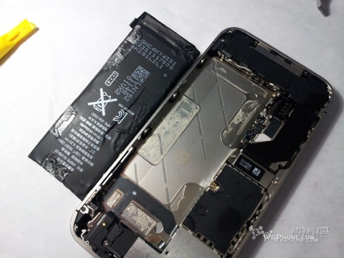 第二步,拆電池。先擰掉兩個小十字螺絲,可以拿下電池連接主板的連接頭和一個小小的觸點片,不知道做什麼用,反正記住住置,最後回裝時不要忘了。然後有一個透明塑料片,可以用來拉,但提醒大家,我的被我拉斷了,實在下面的膠太強勁了。我覺得還是電吹風還是吹熱一下,好拿。我是好幾天沒用手機,冷機來拿。左橇、右橇、上橇、下橇,終於拿出來了,iphone4s的電池讓我很擔心,感覺像軟性材料做成的,竟然會隨著我橇,變型彎曲了,當時已經動手了,也就隨便了,真拆壞了電池,只好再買了。不過雖然偶的電池有點像橡皮泥,但還是可以正常使用,哈哈。有點誇張了。