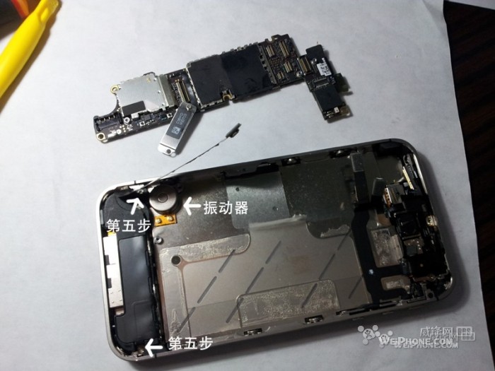 第五步,拆下面送話器和喇叭總成,以及振動器。左,右兩顆螺絲。然後取下,這是這麼簡單。振動器膠很強,這回不像拆電池強拆了,先上電吹風,吹下,然後就刀片挺出,沒有任何線,沒關系的。不拿掉振動器,中殼和前殼固定的一顆镙絲擰不到。