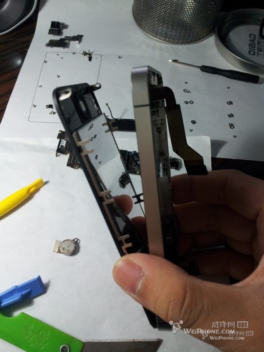 第六步,分離中、前殼。機器背面正視圖,左上角,有一個黑膠皮,直接撕下,我是先用橇板,再用鑷子,省得破壞了美觀。 然後就是擰镙絲,四角四顆,兩側各三顆,共十顆。然後就刀片輕輕插入頂端前殼與中殼之間,然後我就手了,慢慢用力分,沒有卡子,只有膠,注意頂端兩條屏線就OK。