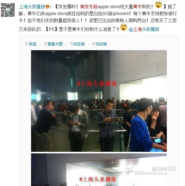 另外微博爆料上海南京東路的apple store出現大量黃牛。。。不知道有什麼消息麼莫非。。