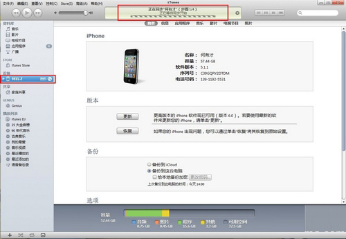 將數據導入手機我們就要先將設備與電腦連接,打開iTunes,左側列表中會出現自己的設備名稱,需要注意的是,在連接之後iTunes會自動備份,無視就可以了。