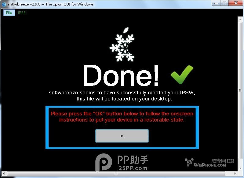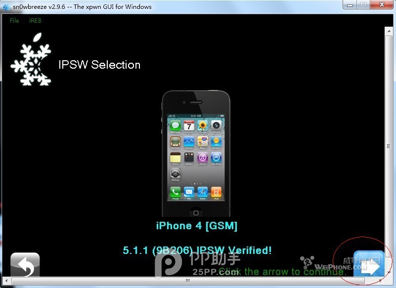 sn0wbreeze 會自己識別,確認無錯誤,點右下角的箭頭