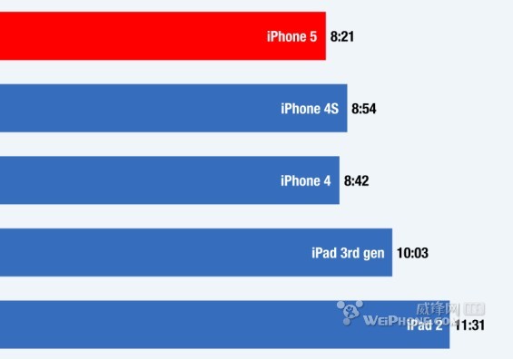 根據James的測試,iPhone 5電池的續航時間為8小時21分鐘,比不上iPhone 4S的8小時54分和iPhone 4的8小時42分。iPad 3與iPad 2由於電池比iPhone要大,自然續航時間比iPhone要長,各自的續航時間分別為10小時零3分和11小時31分。