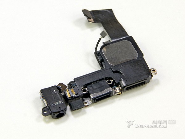 十八,解剖完主板後,我們將目光轉向後背殼。接下來拆Lightning底座接口組件,包括耳機孔和揚聲器。看這部分零件,蘋果是不得不縮小底 座接口,顯然這個組件容不下30-pin的底座接口。底部的麥克風擠在耳機孔和Lightning底座接口之間,躲在第二個揚聲器孔後面。