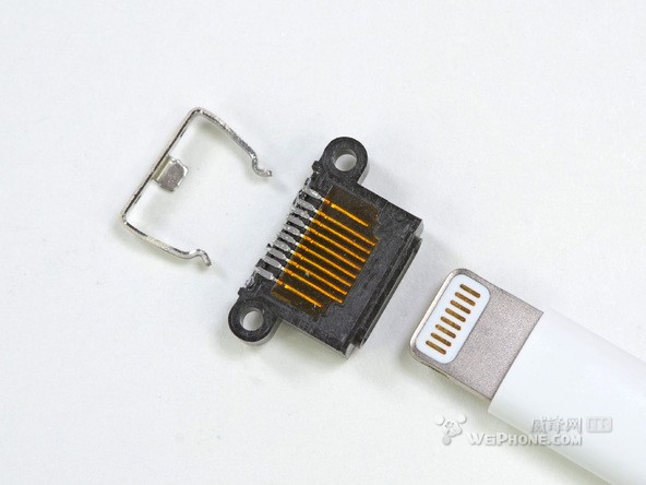 下面我們近距離地看一下這些零件,我們可以清楚地數到底座接口的確是8-pin,雖然蘋果官方沒有詳細解釋,但其中兩針是用於供電和接地,其他6針還不知道什麼用處。