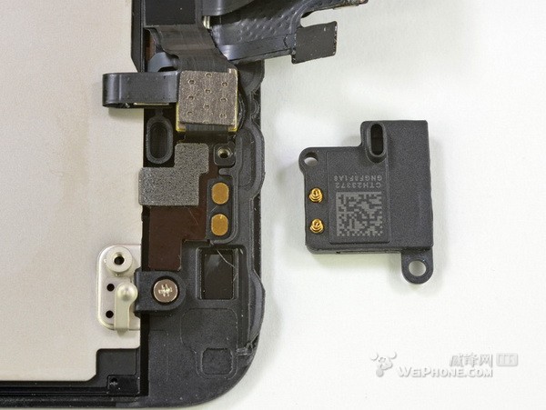 二十一,聽筒是兩枚螺絲釘和連接器跟屏幕集成固定起來,中間隔著彈簧。iPhone 4S 的揚聲器本來是粘貼在脆弱的電源按鍵排線上,需要很細致才能拆出來。iPhone 5的揚聲器從屏幕集成輕松一按就彈出來了,又一個容易維修的體現。