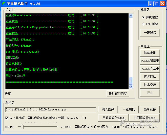 我的是IPHONE4的機器,4S木有,沒試過,一次刷過,沒有任何錯誤代碼