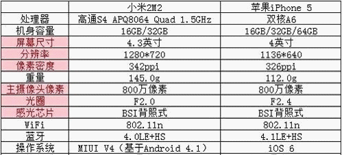 在中國,被譽為“中國蘋果”的小米手機2也在受到大眾的期待。在816發布會的時候,這款手機無論是配置還是設計,還是性價比,都給大家帶來強烈的震撼。今天也有媒體單獨制作了關於小米手機2與 iPhone 5的參數對比。