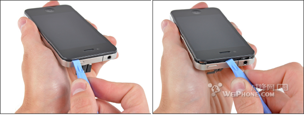 4、在step 28的時候圖中是從開機鍵那邊敲的,其實從耳機口那邊敲比較容易。先頂住step 23中被螺絲擰住的黑色金屬圈,就可以看到屏幕和中框有縫隙了。