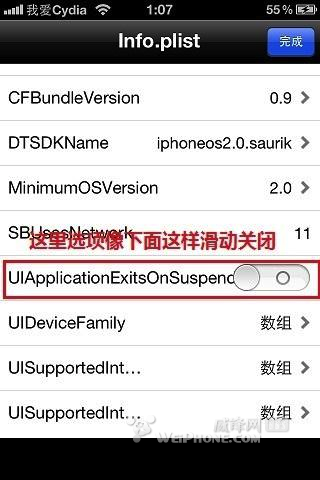 大家用iFile打開如下地址:/var/stash/Applications/Cydia.app,找到裡面一個叫“Info.plist”的文件點擊,選擇“屬性表編輯器”的方式打開,找到裡面一個叫“UIAplicationExitsOnSuspend”的選項,把開關關掉,如圖。