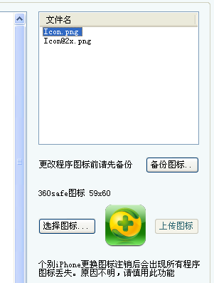 單擊icon.png 看到360safe圖標 59*60了嗎?這就是圖片的尺寸,要替換先把素材圖片尺寸弄一樣,然後選擇圖標,上傳圖標。一個一個替換,有點麻煩。然後注銷就可以了。