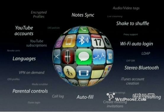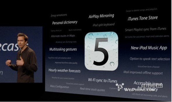 2011年6月6日開發者大會上蘋果首次介紹iOS 5,它帶有1500多個新的API以及200多個新的用戶級特性,在大會上蘋果重點介紹一下10個特性: