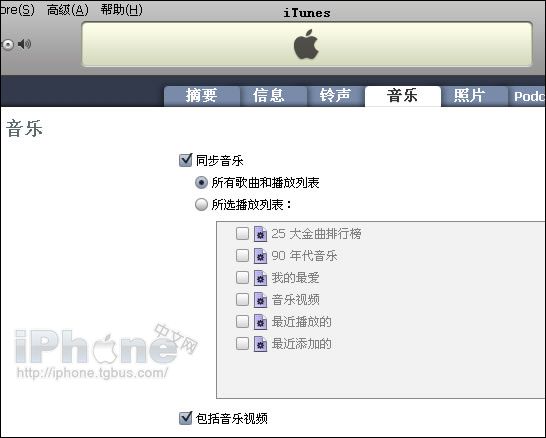 在“音樂”操作界面中,你可以同步已導入iTunes音樂資料庫中的歌曲。