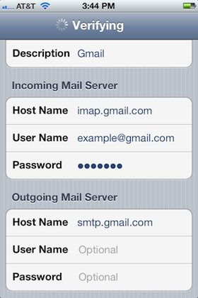 在下一屏中填寫收發郵件服務器。收信服務器名為 imap.gmail.com。你必須在“Incoming Mail Server”下再填寫一遍Gmail地址和密碼。發送服務器名填寫 smtp.gmail.com。常規Gmail用戶的外發郵件設置是不必輸入登錄信息的,但谷歌應用的用戶(其他某些用戶也會如此)必須輸入。如你遵循本指南操作仍不能發送郵件,可以試著把你的登錄信息填寫到外發郵件服務器處,然後看看是否能修復該問題。