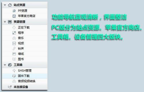 PP助手電腦版(PP助手PC版)分為站點資源、資源管理、工具箱、設備管理四大版塊。站點資源包括了PP資源和蘋果官方商店App Store的資源,包括軟件、游戲、音樂、鈴聲、牆紙、專題。