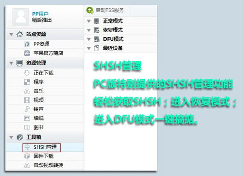 PP助手PC版推出了SHSH管理,能快速獲取SHSH,恢復模式,DFU模式。設備SHSH備份,刷機服務,更方便實用,讓您不在因為忘了備份SHSH而苦惱糾結。