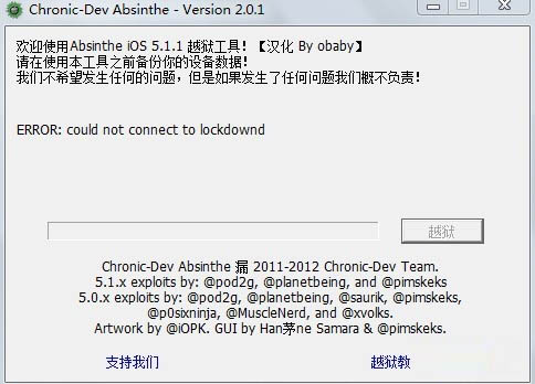 目前,iOS5.1.1系統使用的完美越獄工具是Absinthe 2.0.1,這款工具的越獄方法就是“一鍵越獄”,將iPhone或iPad用數據線與電腦連接後,點擊Absinthe中的Jailbreak(越獄)按鈕,然後耐心等待就可以了。可即便是這麼簡單操作,還是有可能會失敗。使用Absinthe越獄失敗得到提示通常有以下三種:
