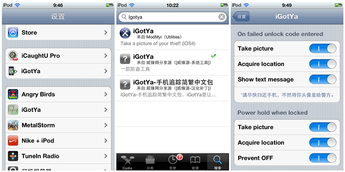 與Appstore中同名的應用是不一樣的,需要越獄才能安裝。iGotya界面為全英文,雖然有繁體的補丁,可傳言並不太穩定,還好設置內容不多,英文不好的童鞋也能搞定。用戶設置鎖屏密碼後,只要解鎖出現錯誤,前置攝像頭就會自動偷拍照片,並附上地理位置發至用戶郵箱或者其他手機聯系人。而且用戶能設定禁止關機,這讓小偷在短時間內無法消除位置。