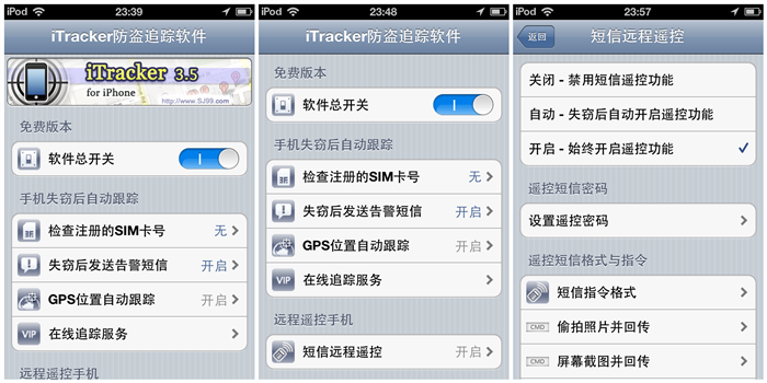 iTracker基本具備了手機遺失後能進行的所有追蹤手段,包括失竊後的自動跟蹤、遠程遙控手機兩大方面。用戶需要在應用中注冊SIM卡號,當有人將注冊的SIM卡拔除並插入新的SIM卡時,軟件會認為手機可能失竊,會根據用戶之間開啟的設置,完成發送警告短信、跟蹤記錄手機位置等措施。而且用戶還可以通過短信發送指令遠程遙控丟失的手機偷拍照片、關機、播放刺耳警報等。該應用還支持圖標隱藏功能,任何人都無法在手機中找到它。