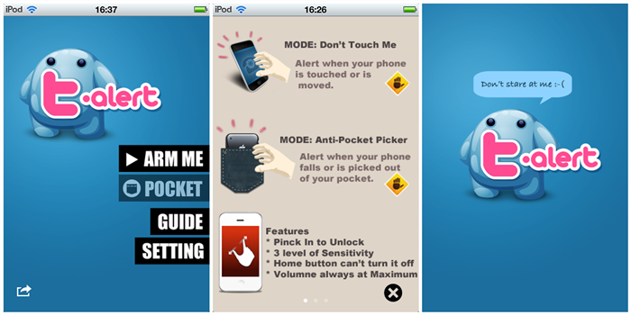 口氣很大,號稱世界頂級防盜器,其實也就是一個帶警報功能的圖形密碼應用。用戶在開啟應用後會設定一個手勢作為密碼,然後運行該應用,任何移動設備的舉動都會引起最大音量的警報,輸入正確的密碼才能關閉警報,並且警報不會受到音量鍵的控制。