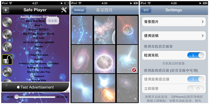 大家在屏幕中間看到的並不是歌詞什麼的,而是播放列表,用戶可以直接點擊歌曲名稱選擇播放。背景圖片也有多種進行選擇,多為星際圖片,顯示效果不錯。當耳機從iPhone上拔出,或者iPhone遠離用戶身體(12元完整版),警報會立即響起,即使按下Home或者電源鍵警報仍然會持續進行。