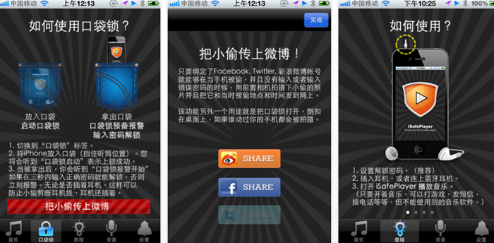 是不是最強的不知道,但iSafePlayer無疑是最貴的防盜播放器(18元)。iSafePlayer在拔出耳機或者手機拿出口袋後無法輸入正確密碼時會觸發警報,並能利用前置攝像頭拍攝照片,連同時間和地理位置一直發至綁定的微博分享。iSafePlayer支持後台運行。