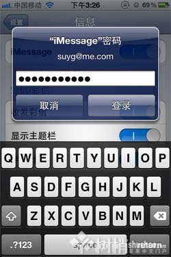 接著就會彈出一個【iMessage密碼】的對話框,把你的蘋果ID的密碼輸進去後點擊【登錄】,這一個是便於iMessage通過蘋果ID來接收信息使用,同時也可以綁定了了手機號碼,有兩種方式可以接收iMessage信息。