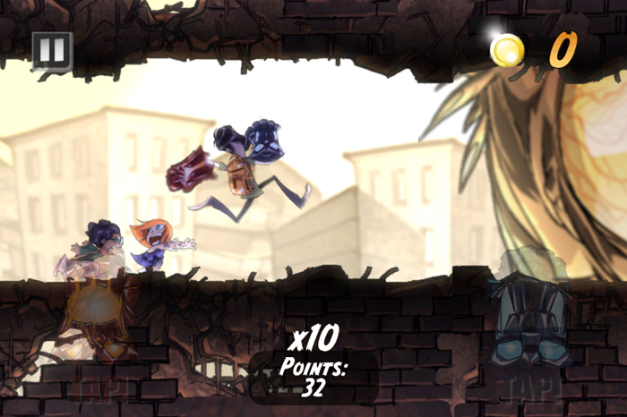 游戲背景如同其名,逃離怪獸的追擊,規則和別的跑酷游戲類似,比的就是堅持距離的長短。操作較簡單,左側為紅色動作鍵,右側為藍色,玩家需要根據前 方出現的不同顏色障礙選擇正確的動作,游戲中會彈出不有不同效果的獎勵,需要手動點取,但我發現這完全就是為了打亂玩家的游戲節奏,誘使玩家出錯的良好工 具,很容易因為貪心而分神,一把撞牆上。在第一個關卡,會出現教學和提示,出拳的時機把握比較重要,而過早或過晚出拳,都會損失生命。游戲的生命數顯示很 特別,以跟隨主角一同逃跑的小朋友的形式顯示,損失生命時,跑在最後的小朋友會被怪獸吐食,發出慘叫。這一設定,新意有,卻是很不人道的,犧牲小朋友來保 全主角,讓人無法認同,主角的雙拳既然那麼威猛,直接回身應該就可以把後面的怪獸抽飛吧。