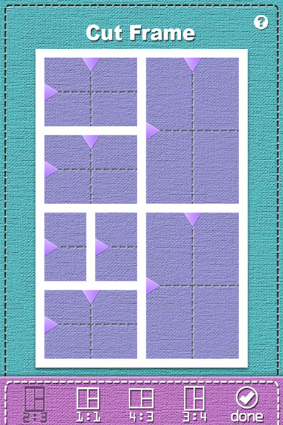InFrame Cut 界面十分簡潔明了,你可以把幾張圖甚至十幾張圖合並為一張照片,並有1:1、2:3、4:3、3:4畫幅可供選擇。在操作時,你可以通過點擊相框中的箭頭並滑動就可以切割相框,讓你隨意設置多張照片之間的比例和調節分配照片的布局,只要你的創意足夠,你可以做出將近1000種拼圖相框。不過郁悶的是你劃分的相框越多每個部分也就越小,到最後你甚至都看不清每張圖片了,要是能多出一個能設置預覽比例的功能就非常不錯了。