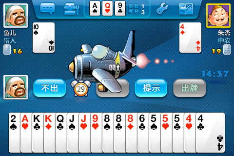 簡評:通過iOS4.0測試,解決了用戶反饋的無法輸入等問題。毫不吝啬的使用華麗的圖片,多而刺激的游戲音效和動畫效果;強大的方言音效,我們 將您發送的聊天信息“說”出來;支持WiFi/3G/GSM,自動探測網絡接入點,不需要用戶自己設置;強大的智能選牌邏輯輔助,如當您想選擇連牌“3、 4、5、6、7、8、9、10”,您只需點擊“3”和“10”,剩下的牌我們自動為您選中;支持手指滑動連選、拖動出牌;支持聊天快捷語拖拽發言功能,幫 助用戶極短時間快速選牌聊天;更配合自動選牌邏輯,相比傳統點選牌更加順暢迅速;根據用戶相應操作給出相應提示,提示一段時間後自動關閉。手動設置關閉新 手提示將不再彈出相關提示。