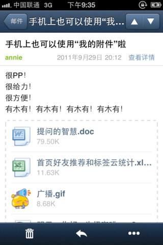 新推出的客戶端中,用戶在發郵件時可以直接在郵件中添加附件,而在收到帶有附件的郵件後,還可以在線預覽。讓用戶在手機端獲得跟在PC端一樣的郵件收發體驗。此外,該客戶端還具有一鍵通過郵件分享圖片文件的功能,比如有圖片文件想要發給朋友,不再需要發彩信或以郵件附件方式,而可以通過從相冊中調用或直接一鍵拍照上傳,就能便捷地將文件發送給對方。