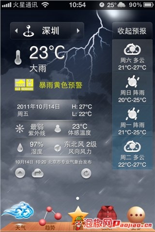 打開墨跡天氣手機軟件,首先我們會需要允許該程序對我們的iphone手機進行一下定位,這樣我們就很清楚的知道自己所在城市的天氣是怎樣的。當然我們也可以手動選擇地區,不過墨跡天氣這款軟件強大的GPS定位功能也是不容忽視的。定位之後我們就可以看到今天和未來四天的天氣情況,包括溫度、濕度等等詳細介紹。