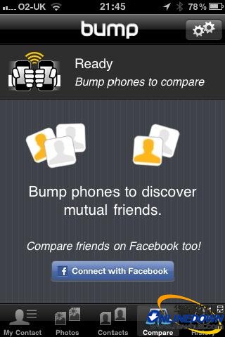 Bump軟件巧妙的利用了iPhone內置的重力感應器,實現了雙機“對碰”傳輸文件的獨特功能。它先偵測是否有人在做“對碰”的動作,如果有,馬上就送一個數據到服務器,服務器就會根據2秒內收到的數據抽出離你最近用戶,然後交換兩位用戶的數據。