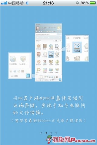 這次QQ手機管家除了除了四大智能機平台各種強悍的功能外,在我們的iphone手機的IOS平台也是很給力的。這次2.0的更新最大的特點就是 QQ網盤。椒友們都知道QQ的網絡硬盤是非常好用的,像小編這樣的上班族,有時候會有在公司處理不完的文件,但是明天又急著用,那只能帶回家去處理了。在之前小編都是用U盤拷回去,現在學聰明啦,使用QQ網絡硬盤安全又方便。