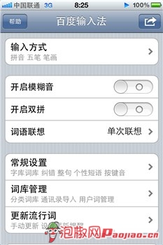 點評:搜狗輸入法將鍵盤劃分為九格宮和全鍵盤,而這個也是最基本的切換,而像模糊音輸入、詞語聯想、在線更新詞庫等,都是以前基本都常用的功能,所以在設置上,大家應該會很習慣這種模式。