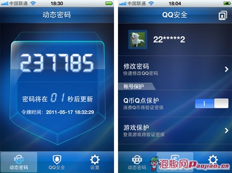 【QQ手機令牌】-動態密碼顯示、QQ安全功能頁面