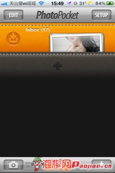 進入本軟件後讓我們來看看基本設置。PhotoPocket的設置,在界面上方分別有刪除(EDIT)、 系統設置(SETUP)選項;第一本軟件默認的inbox,默認拍攝的照片都會存放於此;但是按下方的+號可以新增相冊,命名之後就可以 使用了;最下方的按鈕分別可以拍攝照片和上傳照片、影片。