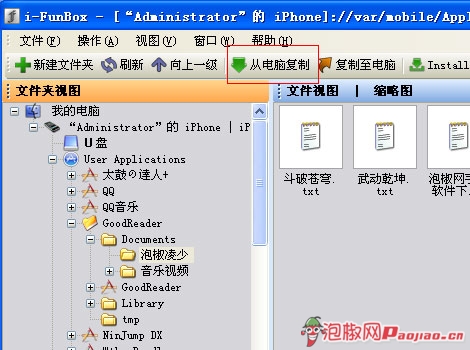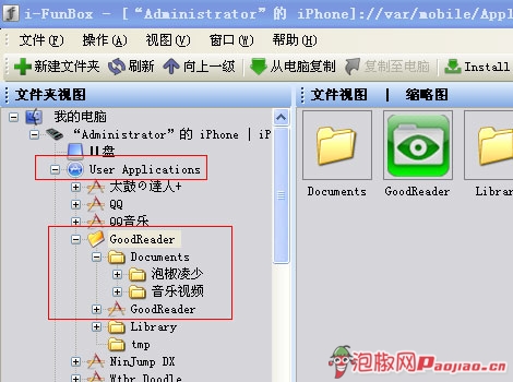 GoodReader的上傳非常簡單,凌少就以單下大家最喜歡用的iPhone文件管理器:iFunbox給大家簡單講一下怎麼樣給 GoodReader上傳文件吧。打開iFunbox,找到“User Applictions”,然後在裡面的路徑中找到GoodReader的文件夾,然後打開自己創建好的文件夾(也可以在iFunbox上創建),點擊上方的“從電腦復制”按鈕,找到自己要傳的文件就可以了。