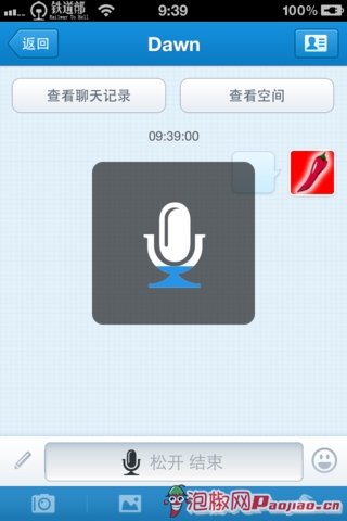 ▲iPhoneQQ正在語音錄音界面【放手即可完成錄音及發送】