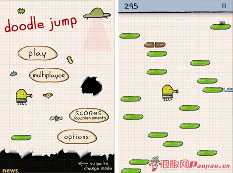 塗鴉跳躍(Doodle Jump),是一個富有趣味的技巧性游戲,在游戲中你要讓塗鴉彈簧小怪物不停地往上跳躍,在跳躍中要小心破碎的平台、移動的藍色平台、黑洞、不明飛行物和壞人,途中有快速上升的火箭和竹蜻蜓,這是一個富有趣味的技巧性游戲。跳得越高,分數就越高,還可以上傳分數哦!