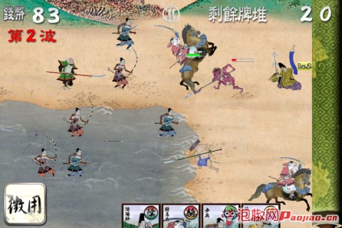 源平大戰繪卷是一款畫面設計獨特的塔防類游戲,采用了日本盛行的動態紙牌,用以代替各種按鈕圖標,在略帶復古的整體背景襯托下,獨特的風格口味,相信亦能贏得不少玩家的青睐。游戲操作非常簡便,觸屏拖動紙牌,放置於屏幕空白處,攔截襲擊將軍的士兵,保護將軍的安全。