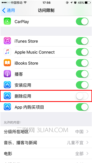 怎樣禁止刪除iPhone中的應用?這個功能在訪問限制中,開啟該功能後可以刪除應用,但關閉該功能後就無法刪除應用了。跟著小編一起來看操作步驟吧: