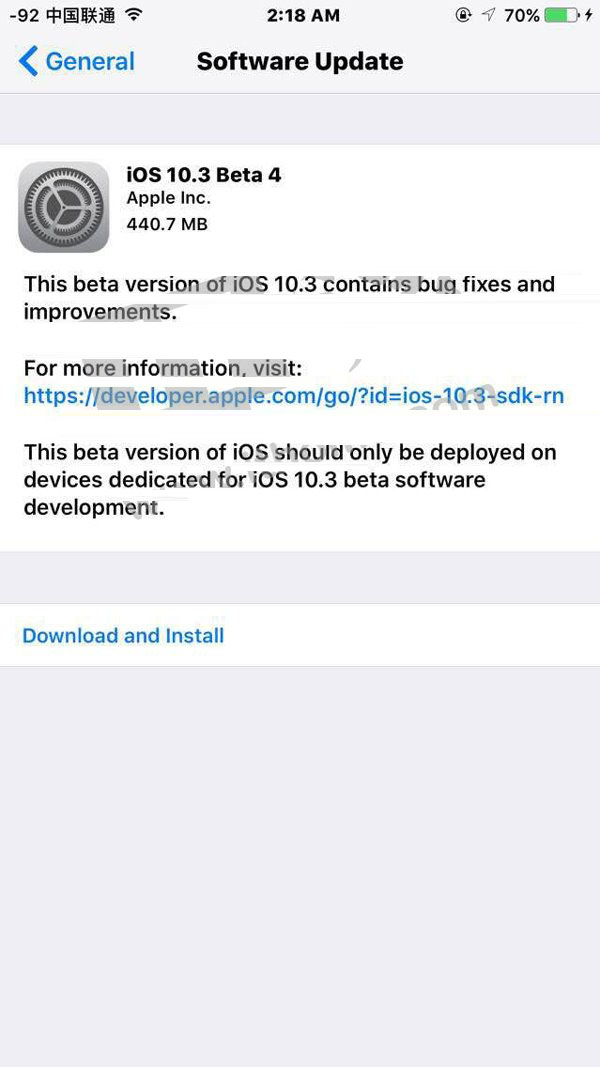 蘋果今天凌晨正式推送iOS10.3 Beta4開發者預覽版固件更新升級,已安裝相應描述文件的iPhone、iPad、iPod touch用戶,可直接在設置中檢查獲取此次更新。本次更新下載安裝包在440.7MB左右,主要是Bug修復和改進提升。