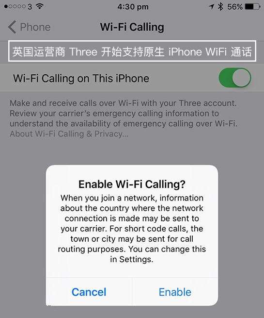 此前,iPhone 顧客只能通過下載 Three 的 inTouch 應用才能開啟 WiFi 通話。最新的運營商軟件更新加入了系統級別的 WiFi 通話支持,用戶可以通過設置——電話——WiFi 通話選項開啟。除了 Three 外,英國運營商 EE 和沃達豐很早之前就已經支持原生 iPhone WiFi 通話。