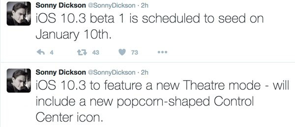 Sonny在Twitter中稱,iOS10.3 Beta1將於2017年1月10號發布,會增加一個名為“影院模式”的新特性,外媒猜測這應該就是增強版夜間模式。另外Sonny還稱,iOS10.3控制中心將新增爆米花形狀的圖標。