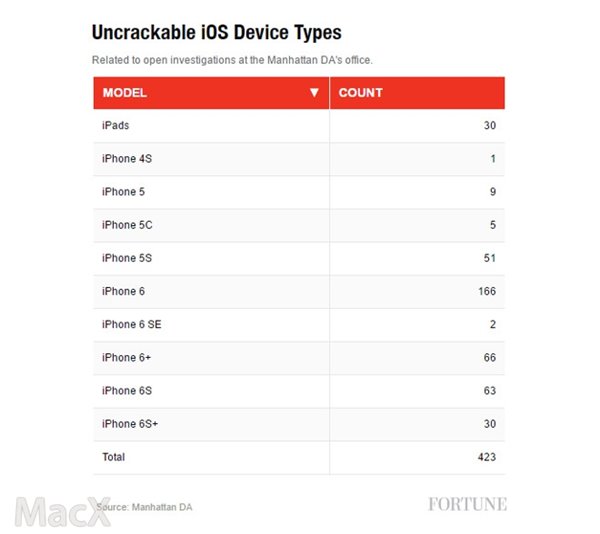 根據Fortune報告,紐約曼哈頓地區檢察官辦公室的證據室內還有423台沒有破解的設備,所有的未破解設備都是運行著iOS 8或更新系統的蘋果產品。