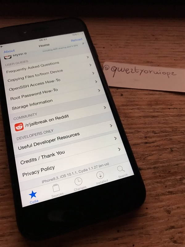 今天,安全研究員Luca Todesco在推特上曬圖自曝,一部運行著iOS 10.1.1系統的iPhone 7(上邊寫著iPhone9,3),已經安裝了Cydia 1.1.27商店。