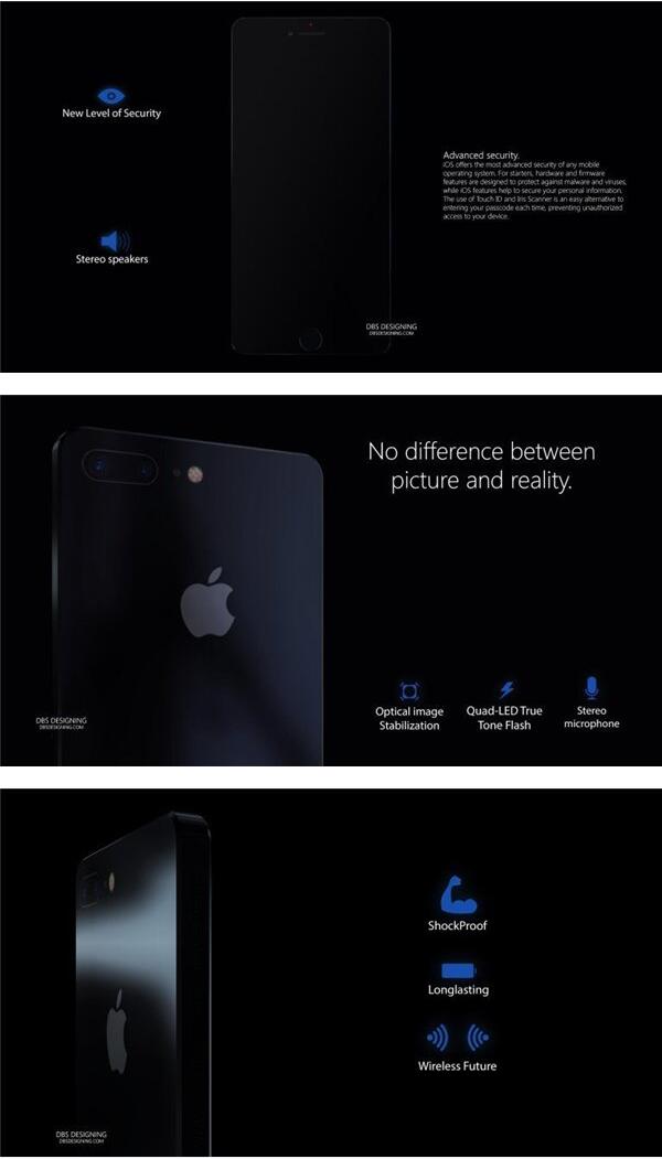 DBS Designing帶來的這款概念iPhone SE配備了5.2英寸的QHD屏幕,當然還包括了一些現在看起來有些誇張的配置,其中包括了1600萬像素的前置攝像頭和2400萬像素的雙後置攝像頭。它還配備了虹膜掃描儀和指紋傳感器,值得一提的是,這些傳感器都被整合到了屏幕的下面。它使用的依然是iOS 10的系統,在128GB的儲存空間和6GB RAM的加持下,保證了它能夠應對足夠多的任務。另外,它還配備了一塊5000mAh的大電池。