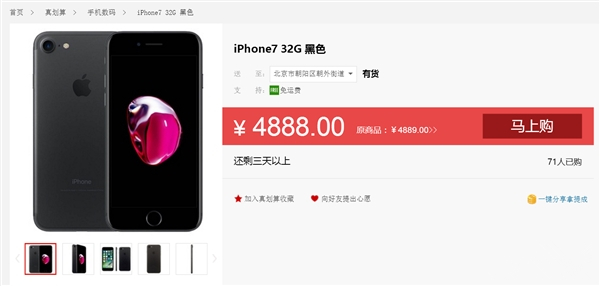 如果等不及的話,不妨考慮一下國美在線上的32GB黑色版iPhone 7,雖然價格貴了100塊錢(4888元),但卻是現貨供應,可直接購買。